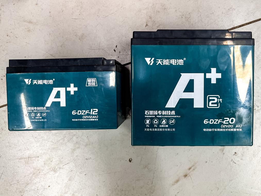 11月14日在上海市郊一家电瓶车销售店铺拍摄的电池。工作人员表示可使用左侧电池帮助解决上牌问题,而顾客实际使用的是右侧容量更大的电池。